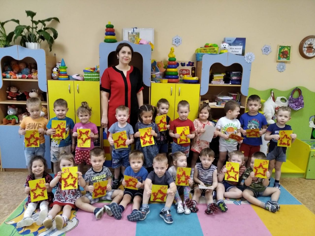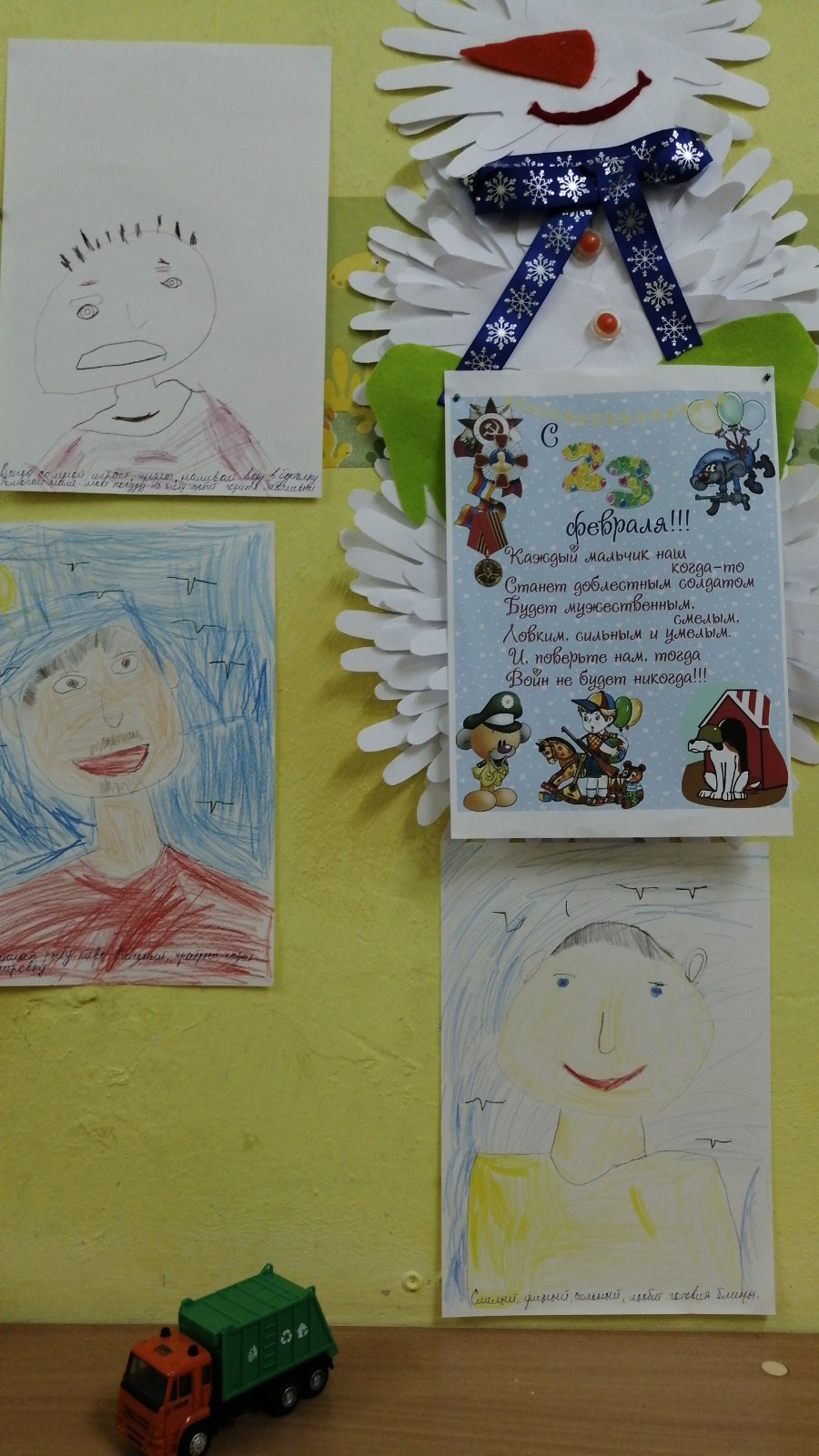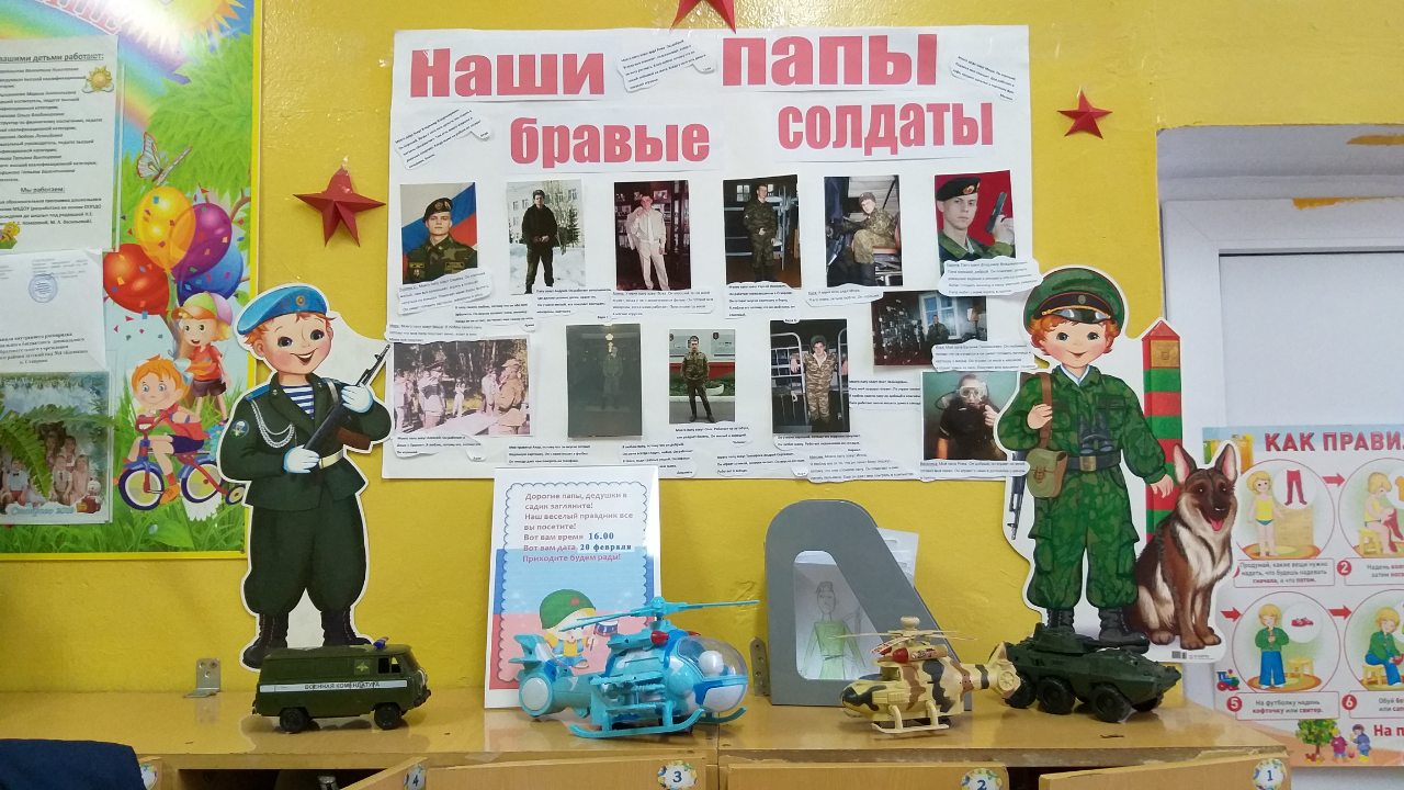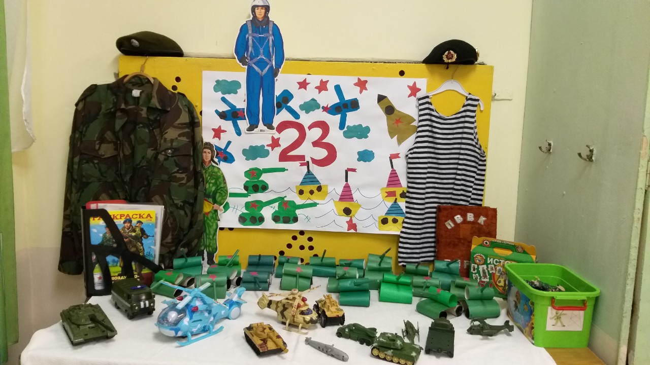 Всю неделю наши воспитанники готовили подарки своими руками: сувениры и открытки, выполняли аппликации, лепили и рисовали для своих пап, дедушек и братьев. Воспитатели совместно с родителями оформили выставки и фотовыставки, посвящённые 23 февраля.