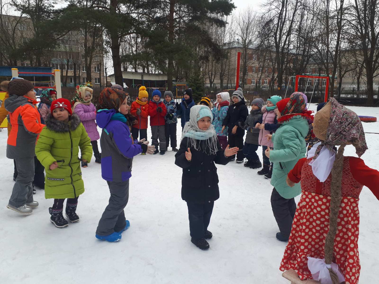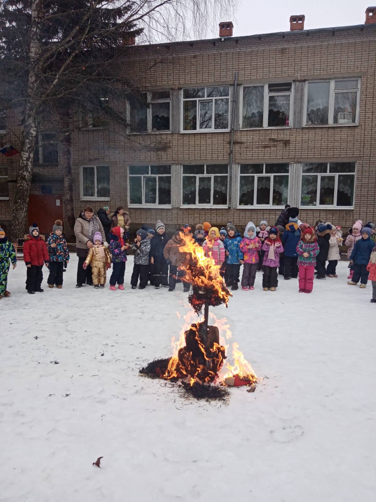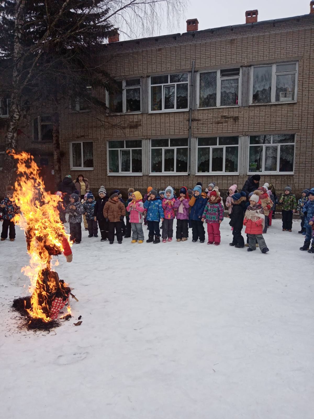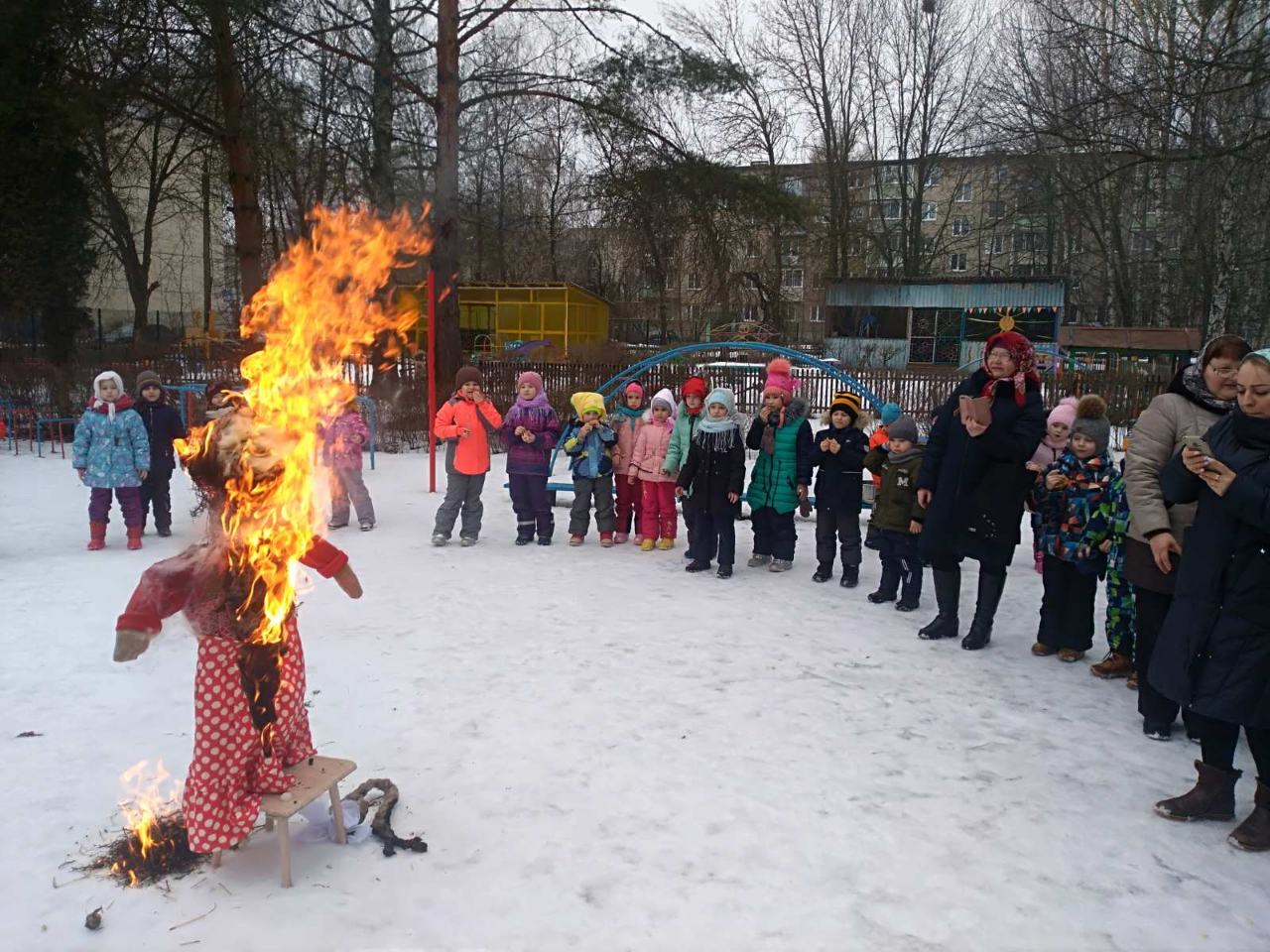Воспитатели и дети с огромным удовольствием надели красивые, яркие платки - атрибут национального костюма и вся детвора высыпала во двор. Масленицу встречали широко с песнями, плясками, хороводами и веселыми забавами. А как хороши, да вкусны румяные блинчики на свежем воздухе! Кульминацией праздника Масленицы остается и по сей день сжигание чучела, как символ ухода зимы и наступления весны.