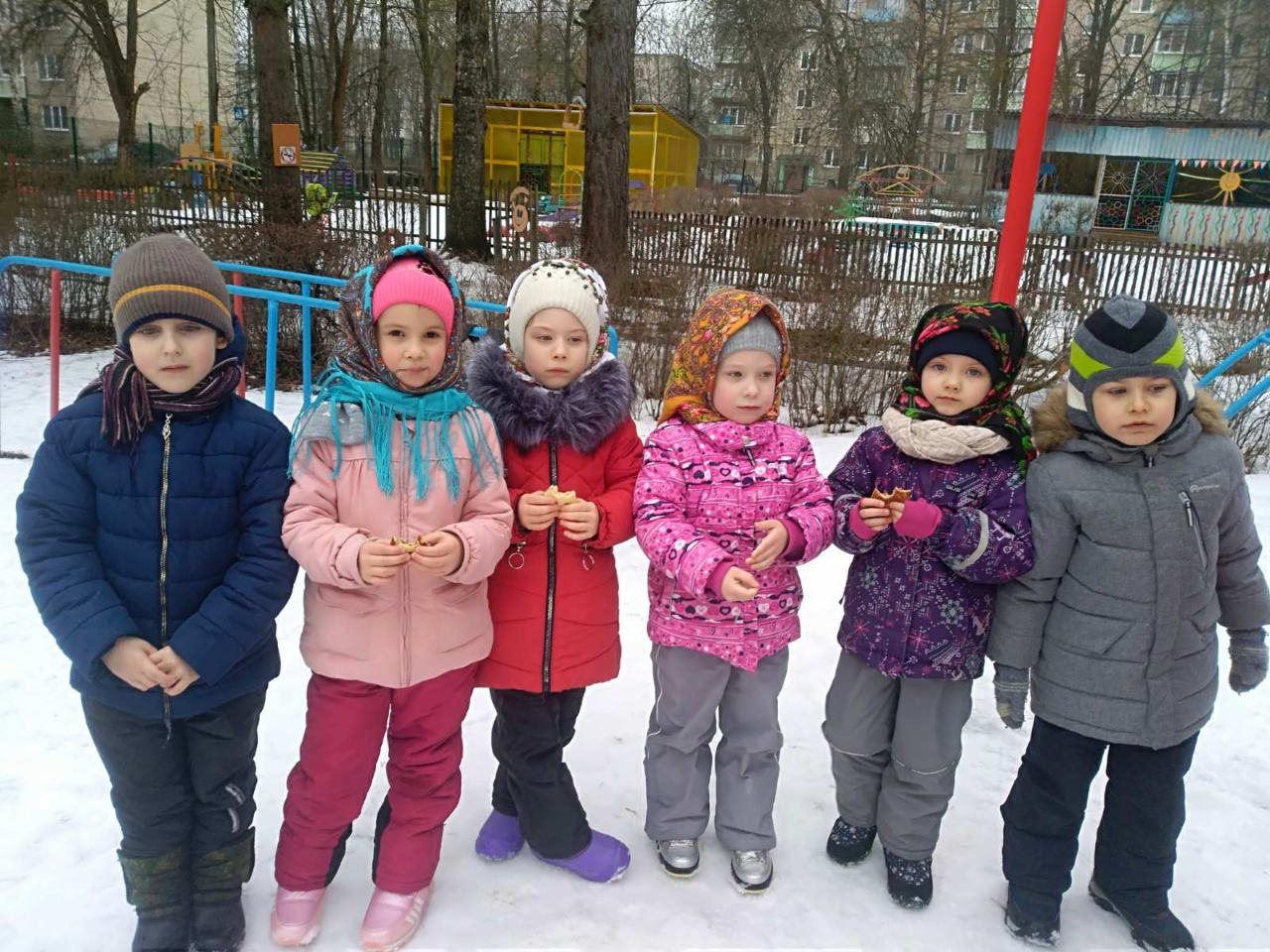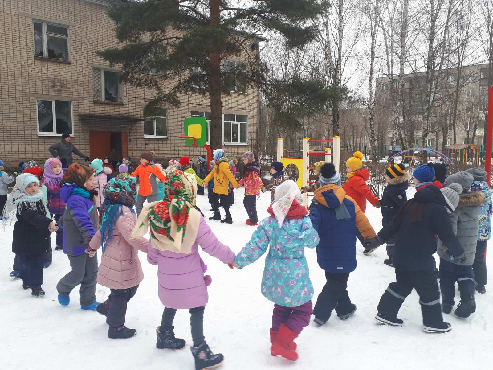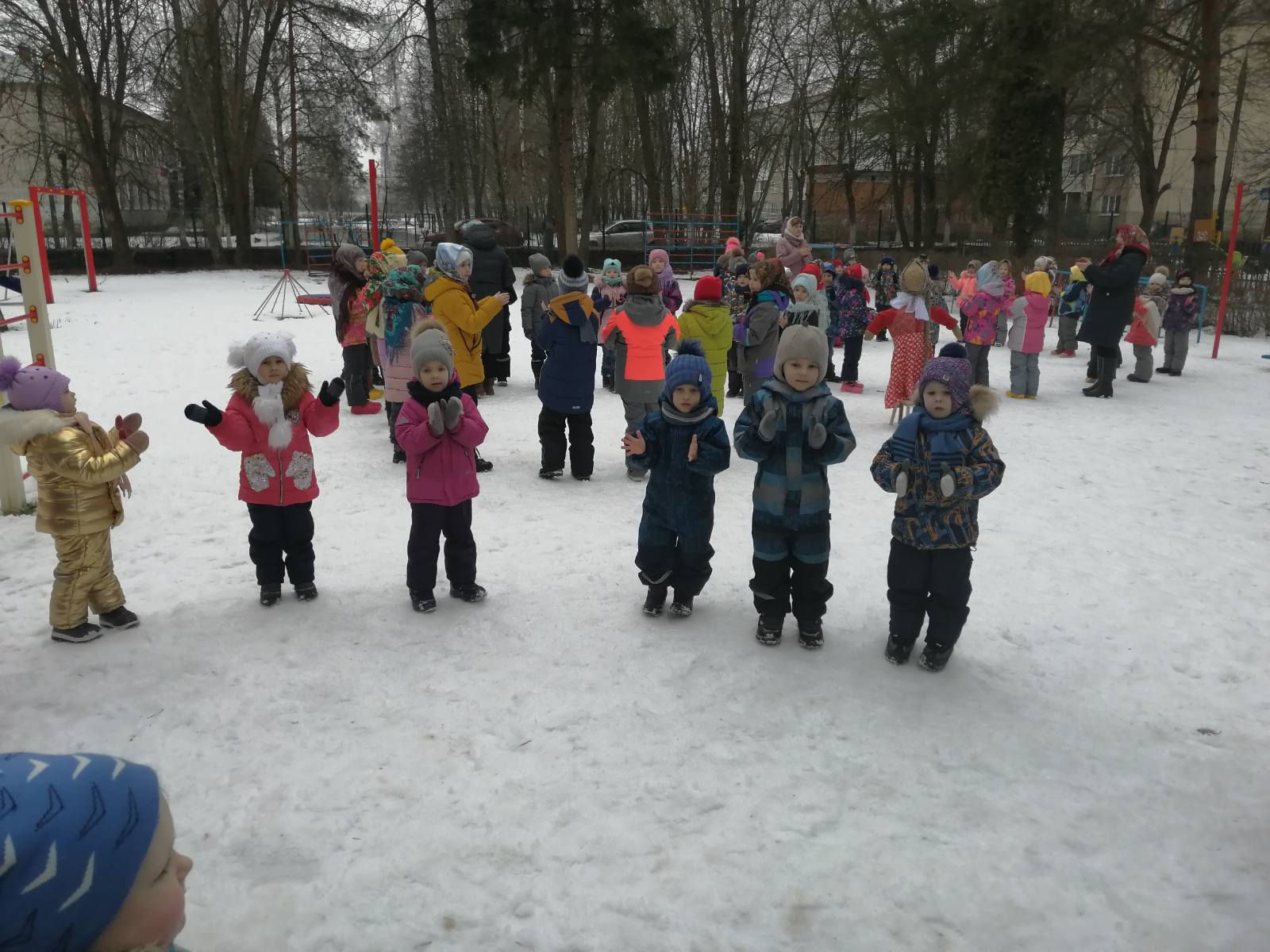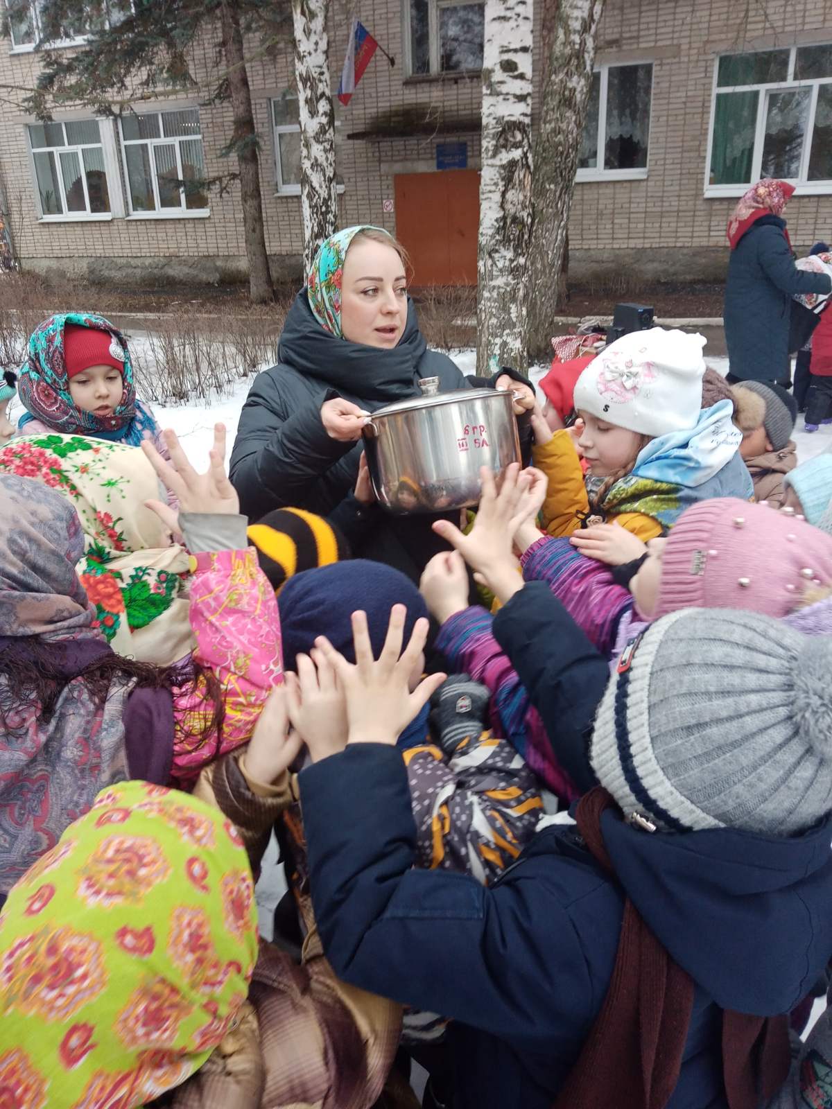 Воспитатели и дети с огромным удовольствием надели красивые, яркие платки - атрибут национального костюма и вся детвора высыпала во двор. Масленицу встречали широко с песнями, плясками, хороводами и веселыми забавами. А как хороши, да вкусны румяные блинчики на свежем воздухе! Кульминацией праздника Масленицы остается и по сей день сжигание чучела, как символ ухода зимы и наступления весны.