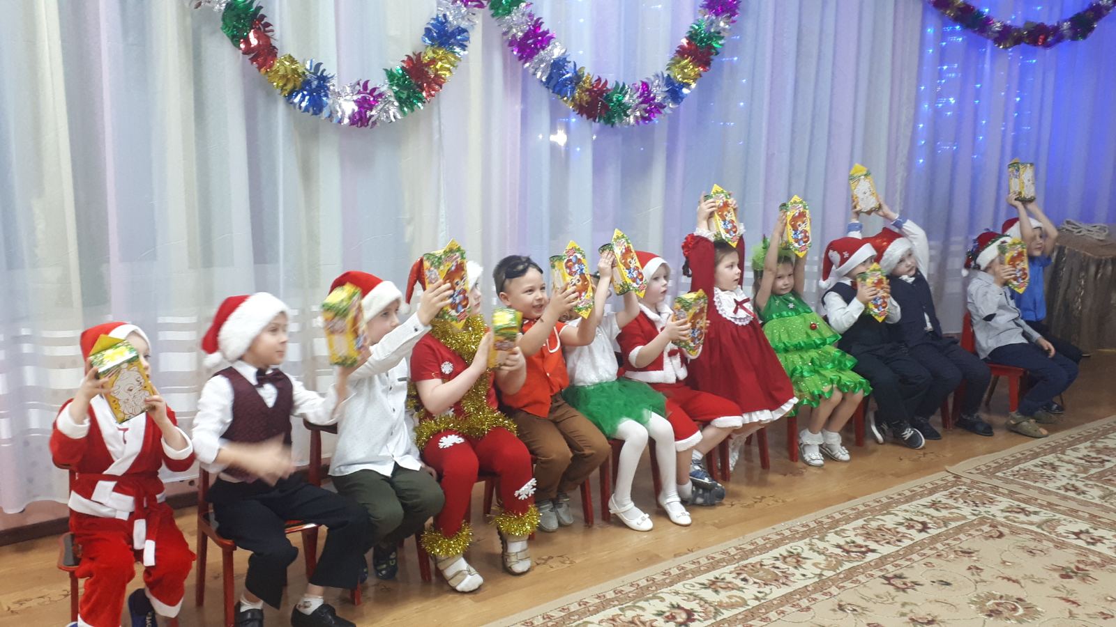Все дошкольники с удовольствием проявляли свои таланты: танцевали, водили хороводы, рассказывали стихи, пели песни, играли. Никто не остался равнодушным. Море радости и эмоций вызвали подарки, врученные детям из рук самого Дедушки Мороза!