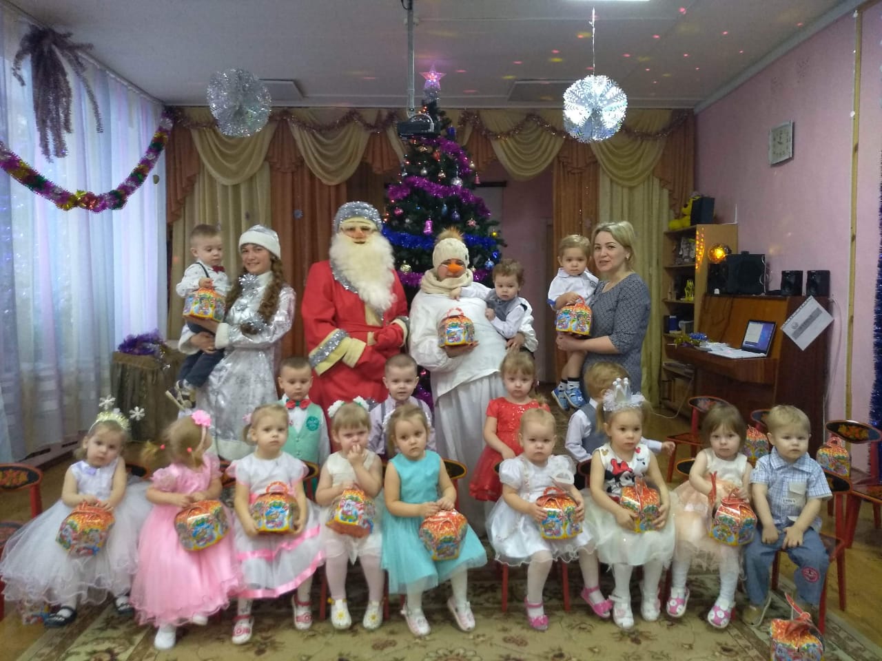Красиво украшенный зал, нарядная елка, великолепные костюмы, подарки, Дед Мороз, Снегурочка и множество других сказочных персонажей ожидали наших воспитанников.