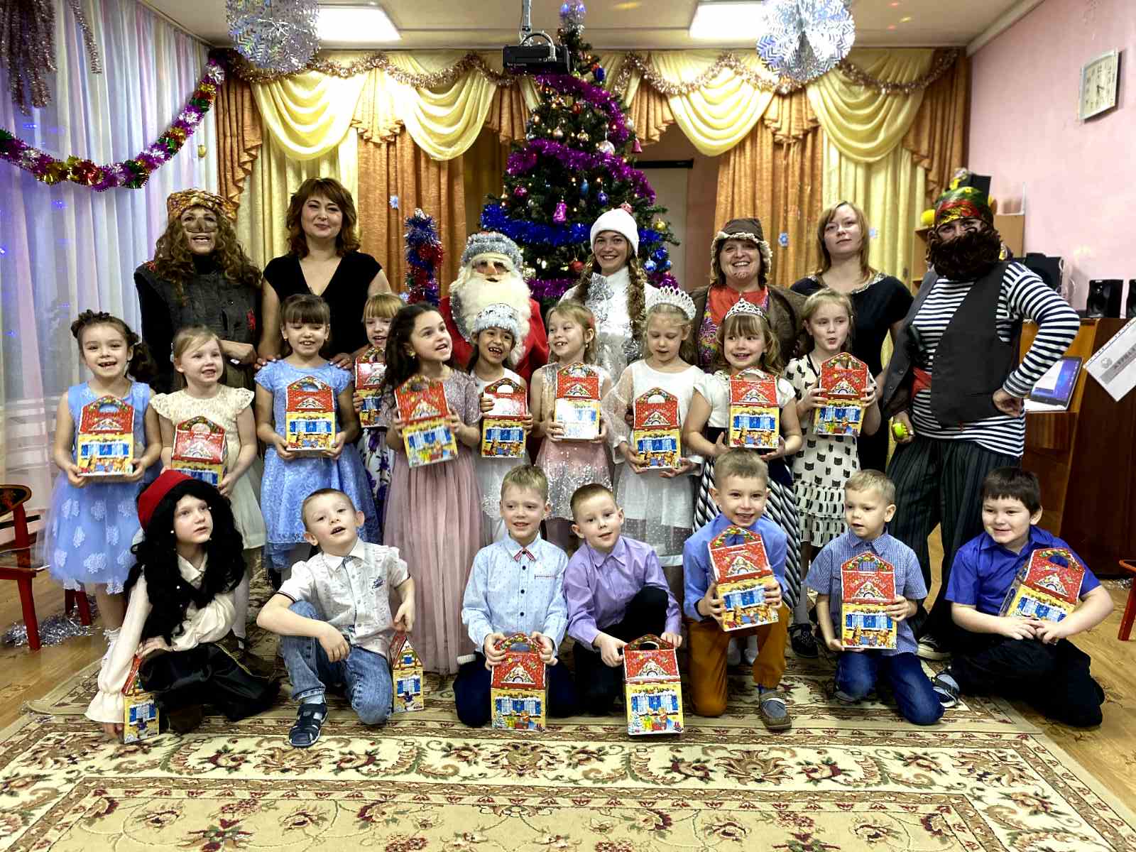 Разноцветные, сверкающие гирлянды и ярко украшенная ёлочка принесли детям ощущение чуда. С самого начала представления сказочные герои увлекали детей в волшебный мир сказки. Дети окунулись в праздничную атмосферу приключений, поучаствовали в интересных конкурсах с Бармалеем, Бабой-Ягой, Домовым и Снеговиком.