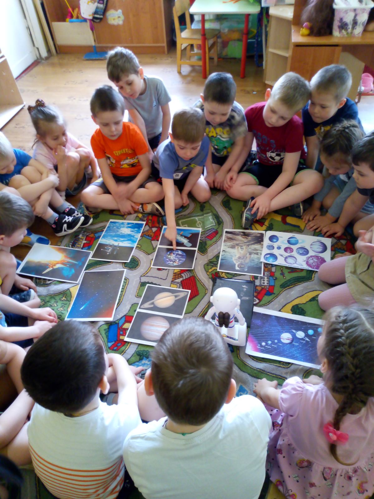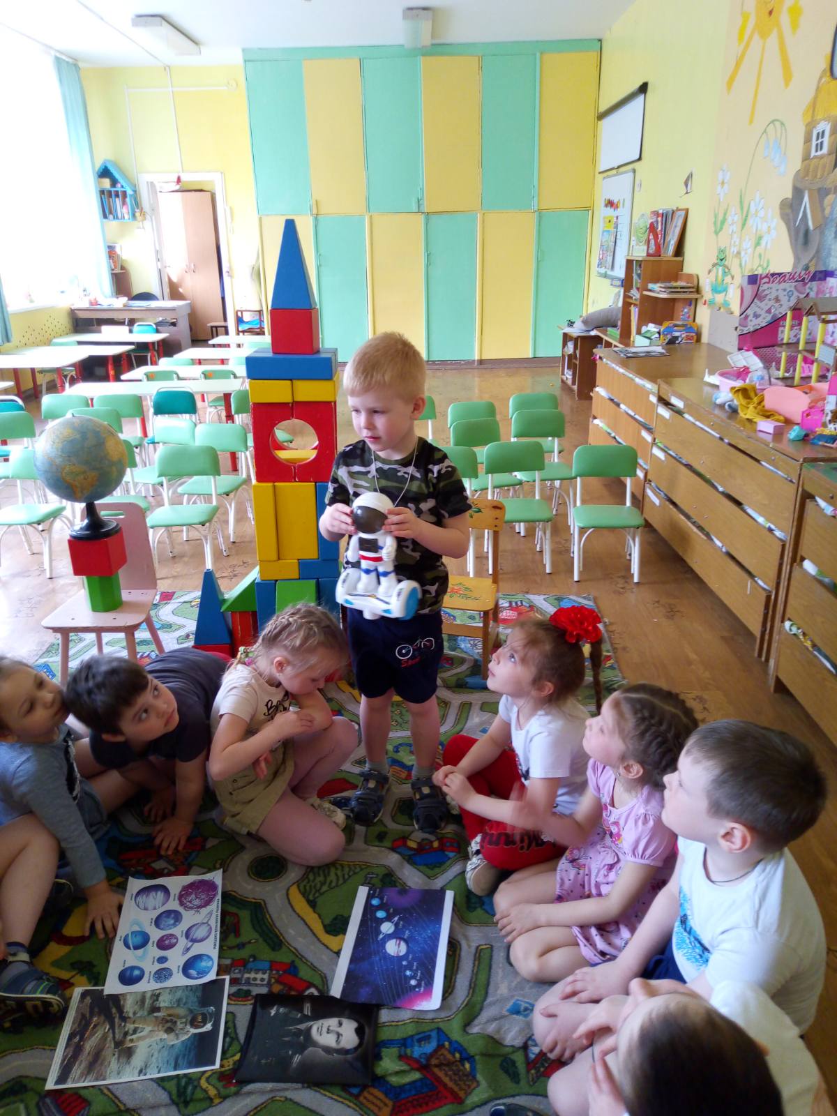 В процессе экспериментальной деятельности дети узнали о форме планет, их размерах, о движении вокруг своей оси; познакомились с космонавтами, уточнили значение слов: «скафандр», «спутник», «созвездие», «метеорит», «орбита», «телескоп», рассматривали фотографии первых спутников, космических станций и героев космоса, о Белке и Стрелке – первых космических собаках — путешественниках, о первом космонавте — Юрии Гагарине и о первой женщине-космонавте — Валентине Терешковой.
