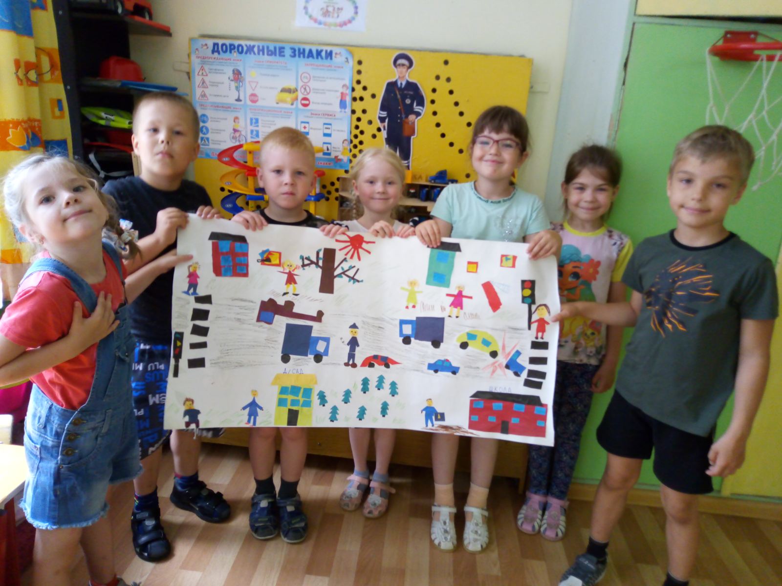 В течении недели дошкольники в игровой форме закрепили знания о правилах дорожного движения, обыгрывали ситуации, отгадывали загадки о дорожных знаках, играли в подвижные игры, конструировали автомагистрали и транспортные средства, создали коллективную аппликацию «Улица города», приняли участие в викторине «Автогонщики, вперед!», а так же рисовали и лепили.