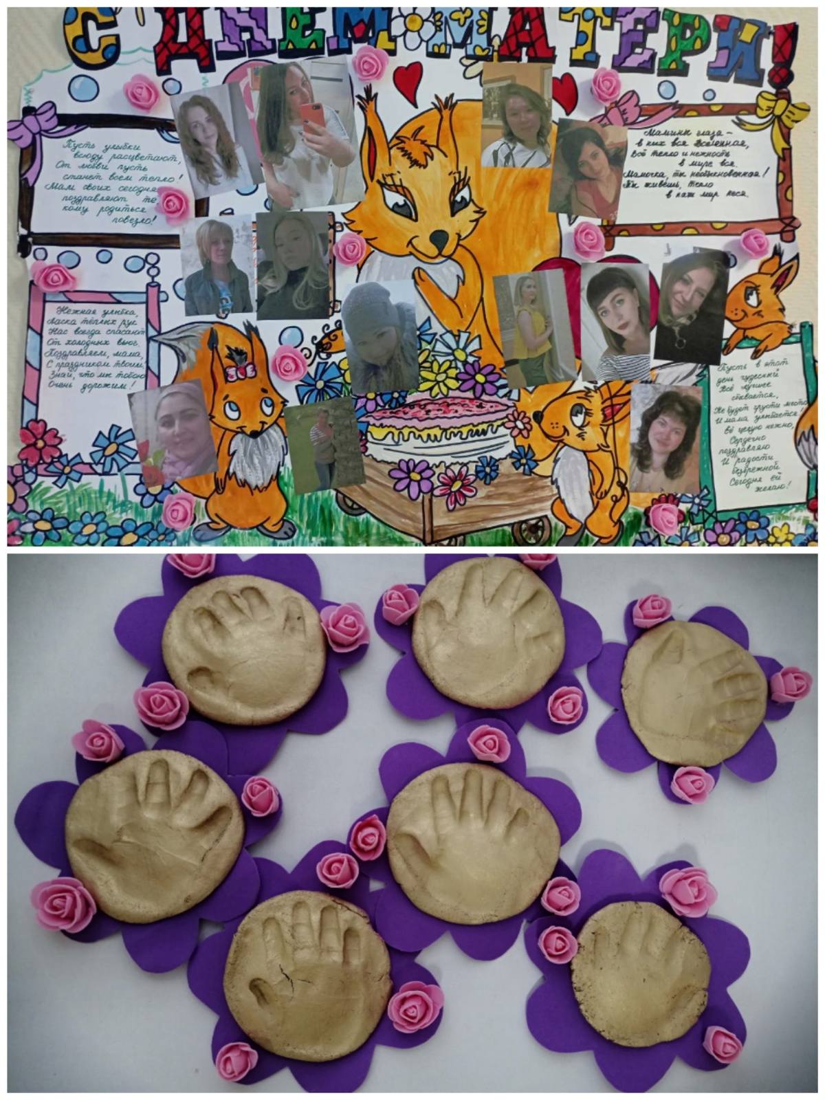 Воспитатели вместе с детьми оформили фотовыставки, выставки рисунков "Портрет милой мамочки", фото-шоп- «Наши мамы топ- модели», выставки маминых работ "Наши руки не знают скуки". Развлечения в детском саду прошли очень трепетно. Были слезы на глазах у мам, от гордости и радости за своих детей. Слышался веселый и задорный смех, от того что мамы играли в детские игры.Все мамы получили подарки, в которые ребята вложили все свои добрые чувства. Хотим поздравить милых дам
