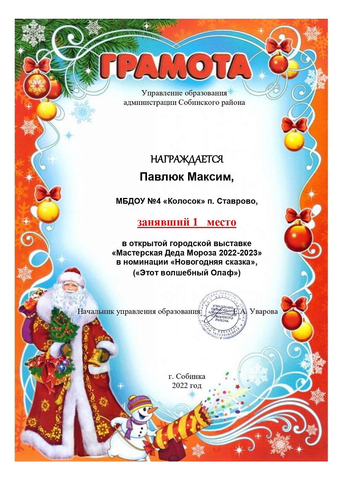 Павлюк Максим (старшая группа) "Этот волшебный Олаф" - 1 место в номинации "Новогодняя сказка".