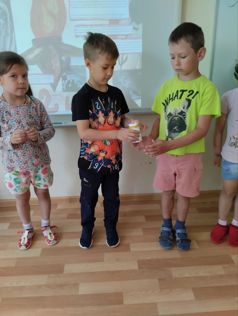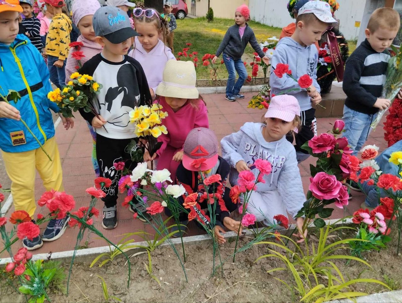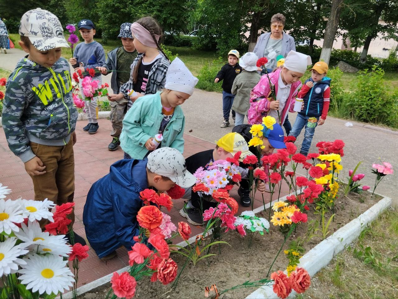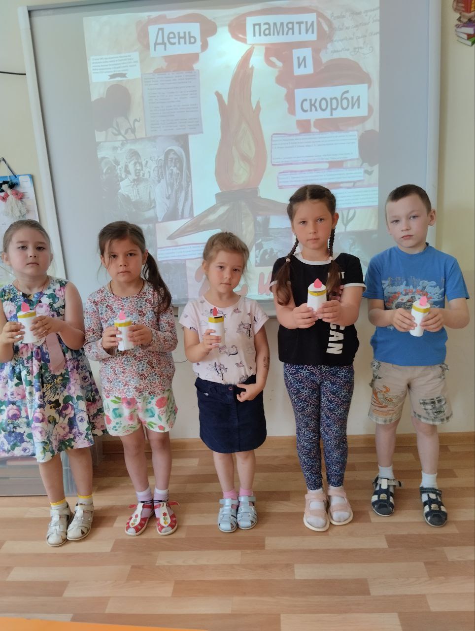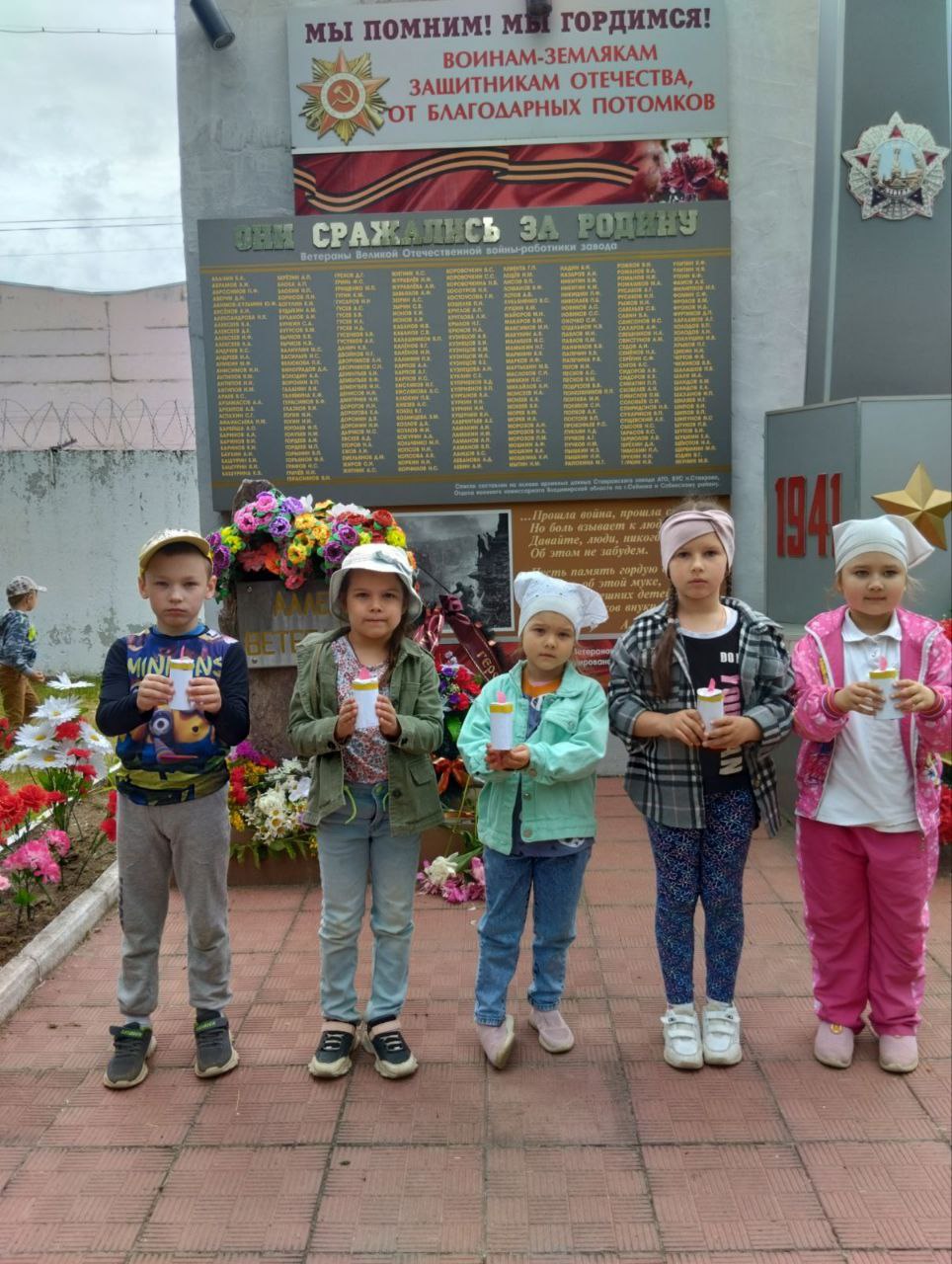 В этот день воспитатели рассказали ребятам о нападении фашистских войск, о долгих и тяжелых годах войны. В исполнении детей звучали военные песни и стихи. Почтив память погибших минутой молчания, дети передавали свечу памяти. А потом все вместе совершили поход к алее Ветеранов.