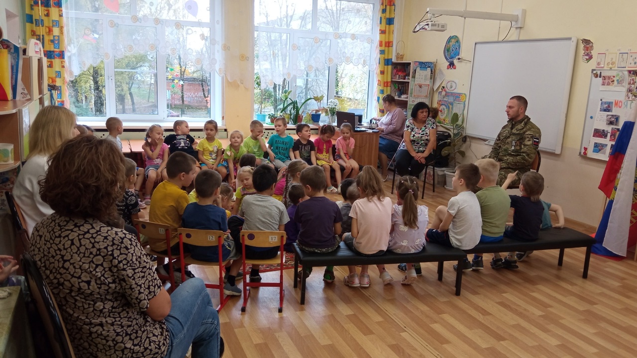 Встреча началась с вопроса - что же такое СВО? Вместе с ребятами старших групп расшифровал эти буквы и рассказал как он вместе со своими боевыми товарищами защищает таких же детей, отцов и матерей своей родины.