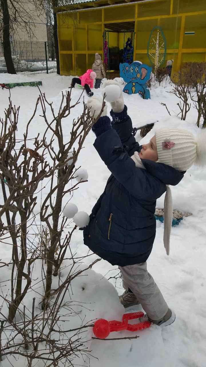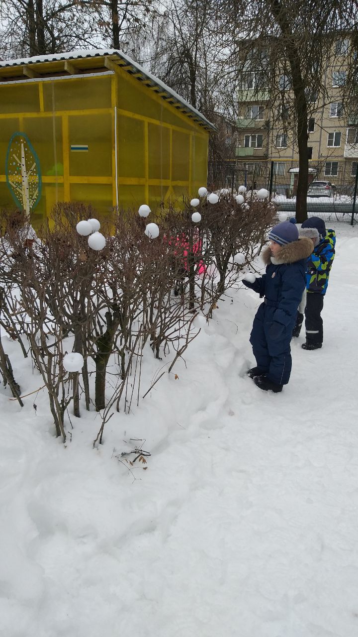Погода порадовала оттепелью и дети лепили из снега и украшали комочками деревья и кусты.