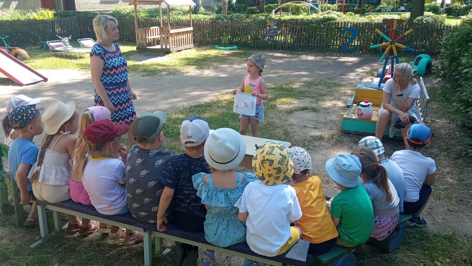 А на прогулочной веранде организован кинотеатр. Дети разных возрастов смотрели сказки "Волк и семеро козлят", "Соломенный бычок — смоляной бочок". Ребят старшего возраста впечатлил мультфильм о смелости, дружбе и верности "Крепыш".