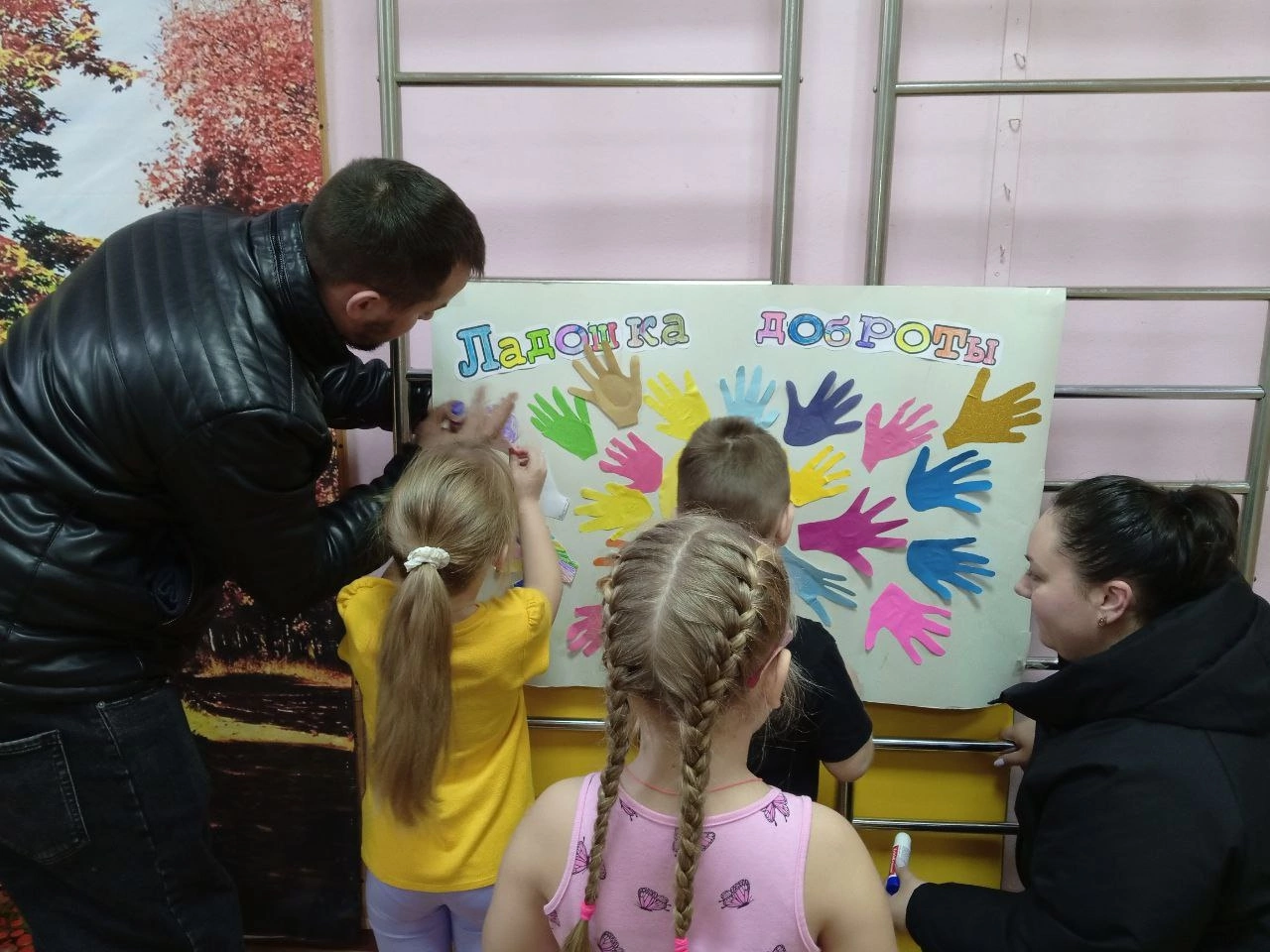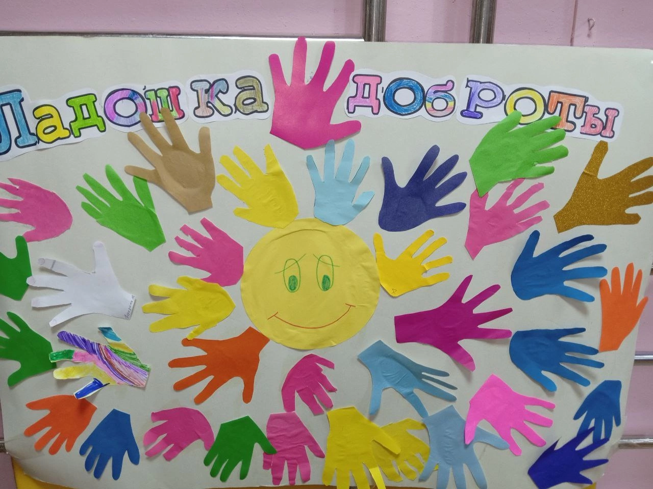 Ребята с родителями вырезали цветную ладошку и приклеили её на общий плакат. Ладошки символизируют счастливое мирное детство.