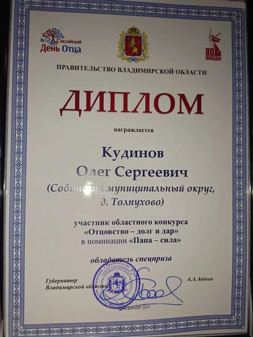 Поздравляем Кудинова Олега Сергеевича с замечательной победой в областном конкурсе «Отцовство — долг и дар»!
