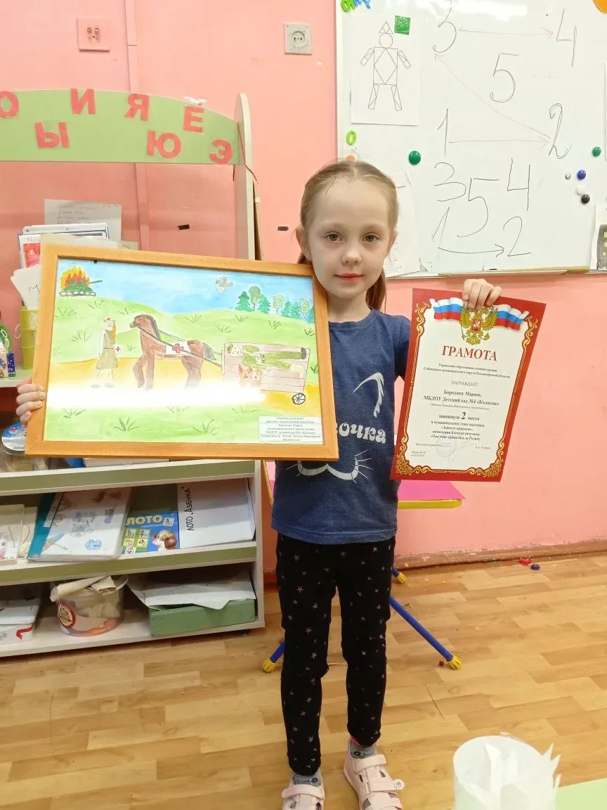 Мария Бородина из подготовительной к школе группы заняла призовое место за свой замечательный рисунок, в котором она показала, как помощь животных в трудное военное время может стать важным подвигом.