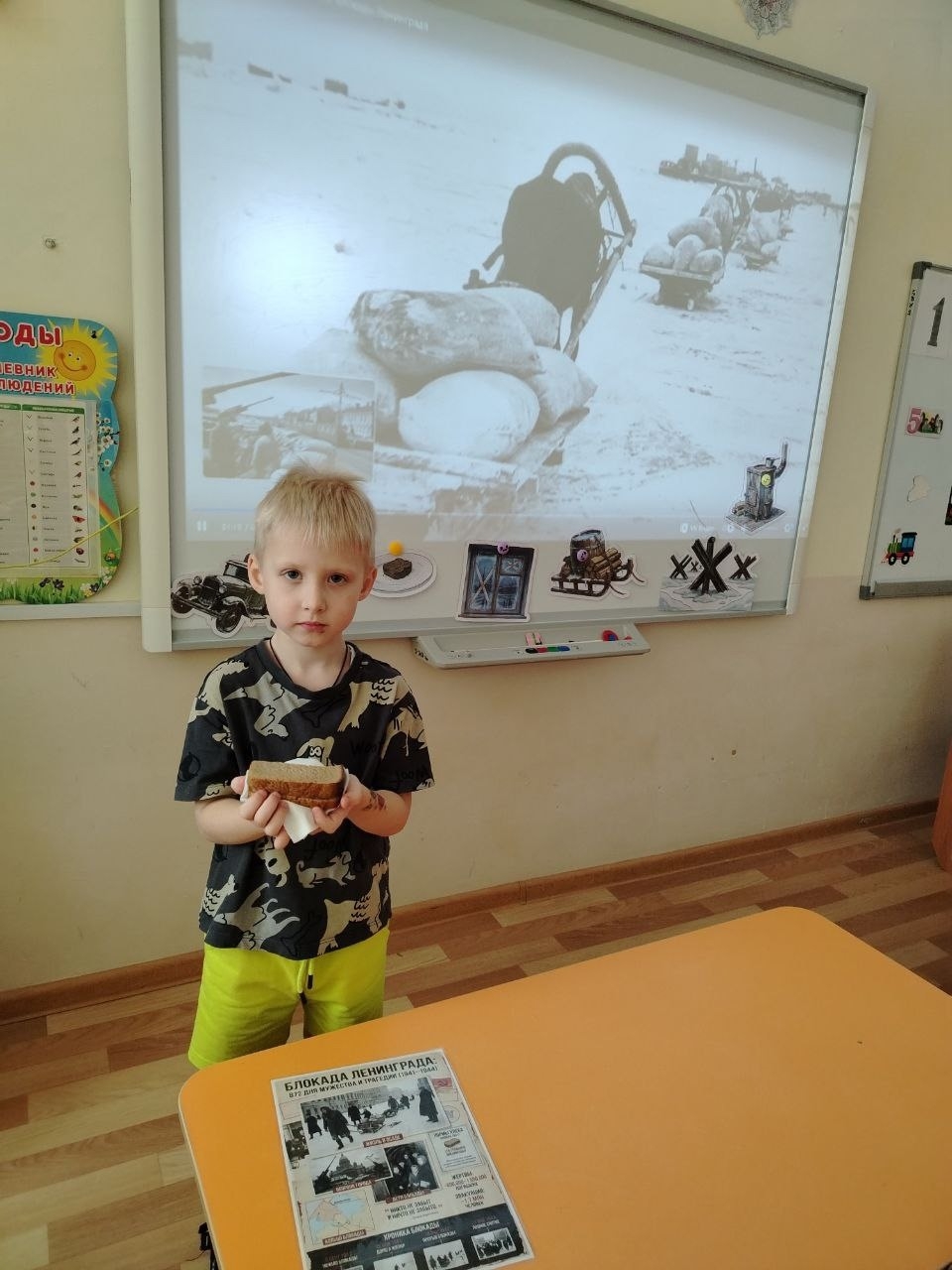 После просмотра мы послушали стихотворение Алексея Марова — «Кусочек блокадного хлеба». В нем говорится о том, какого маленького, но такого важного кусочка хлеба люди жаждали в те дни и как он был ценен для всех.