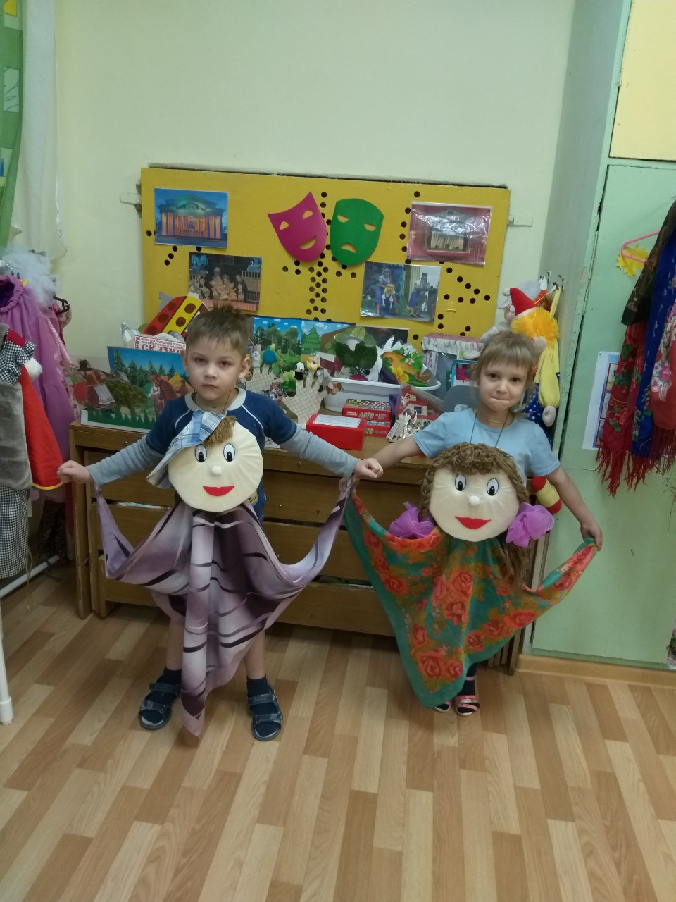 На старшей группы №2 «Пчелки» совестно с родителями воспитатели Зотова Т.В. и Трофимова Т.В. изготовили лепбук «В мире театра», с помощью него дети могут знакомиться с театральной культурой, видами театра, изготовили ростовые куклы из платков.
